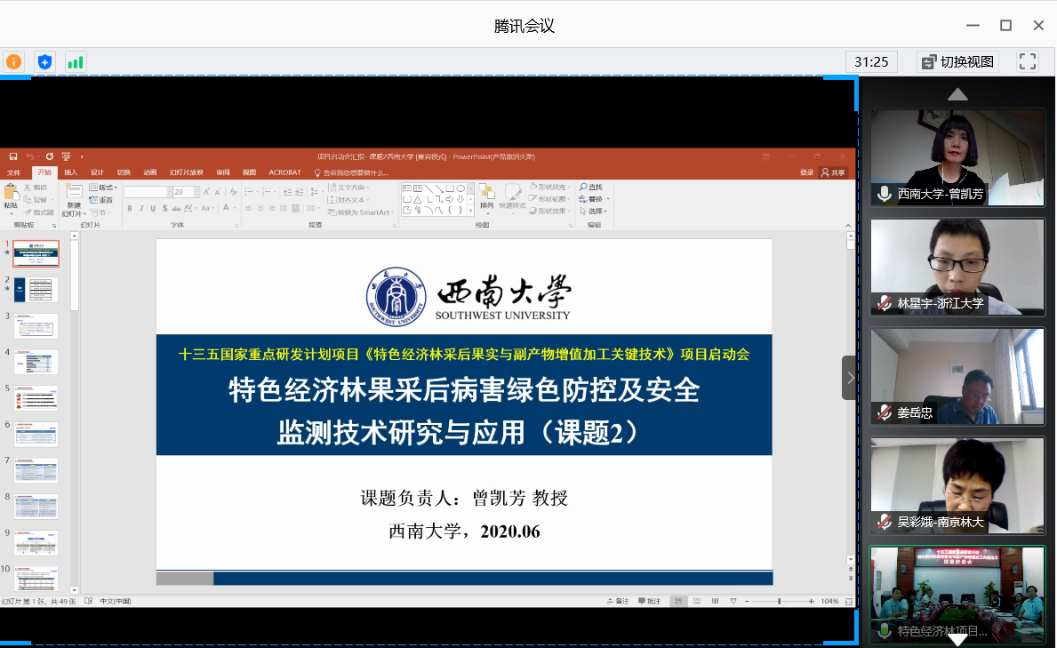 6月19日下午,课题牵头单位西南大学组织子课题参与单位广州粒上皇食品有限公司、华中农业大学、南京林业大学和浙江大学进行课题二“特色经济林果采后病害绿色防控及安全监测技术研究与应用”线上课题启动会,会议由课题负责人曾凯芳教授主持。曾凯芳教授首先就如何达到原始创新与产业化应用的平衡、自主知识产权和成果共享的平衡、完成考核指标和形成标志成果的平衡这三个平衡对各子课题单位提出期望。随后,各子课题单位根据项目启动会上项目组织单位和与会专家提出的建议和意见,就各自负责的子课题前期研究进展、后续实施方案、存在困难、组织管理和合作交流前景等进行了研讨。南京林业大学吴彩娥教授和浙江大学罗自生教授对课题具体实施过程中各子课题单位的研究侧重点、注意事项等方面提出了宝贵意见。最后,曾凯芳教授就课题经费的管理和使用进行了简要说明。