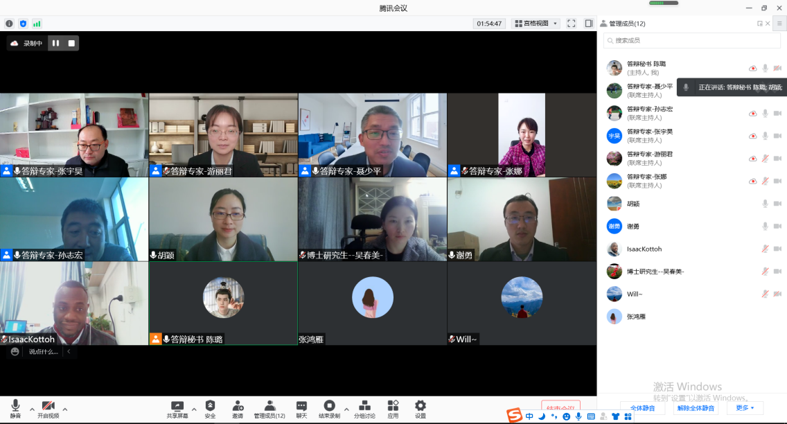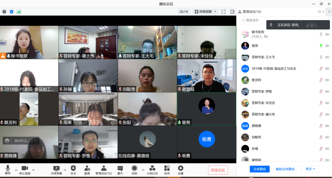 由于疫情反复,我院部分毕业生身处疫情防控地区,结合实际情况考虑,11月19日我院开展了特殊时期硕士、博士论文线上“云答辩”。答辩邀请到南昌大学聂少平教授、内蒙古农业大学孙志宏教授、哈尔滨商业大学张娜教授、华南理工大学游丽君教授以及重庆市农业科学院、重庆万标检测有限责任公司的专家、学者担任答辩委员,我院张宇昊院长、曾亮副院长出席答辩并做专家介绍,众多在校师生通过线上方式旁听答辩。