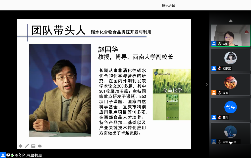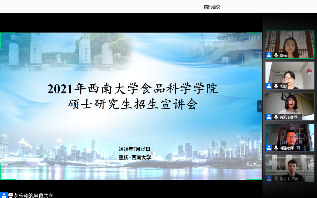 紧接着,周韵副教授、陈栋副教授、刘雄教授、陈应娟副教授、戴宏杰老师、曾凯芳教授、钟耕教授、明建教授依次就碳水化合物食品资源开发与利用、肉类科学与川菜工程技术、特色调味品资源开发与品质调控、茶与特色资源高效利用、食品蛋白质资源高值利用及食品安全监测与主动防控、食品贮藏与物流、西南地区特色植物多糖功能性食品创制、植物多酚营养与健康等研究团队及实验室资源等进行了全面详实的介绍,使同学们对学院的研究团队和研究方向有了更加深入的了解,也有利于帮助他们做出更加明确和坚定的选择。