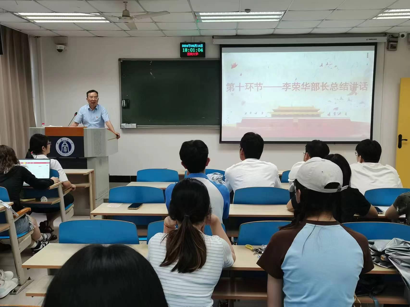 李荣华部长在总结讲话中对本次主题党日的安排和实施予以了肯定。李部长认为本次主题党日活动主题鲜明、准备充分、形式生动、全员参与、效果明显,体现了学院党委高度重视、组织员精心指导、党支部严格落实学校要求。李部长勉励党员同志“革命理想高于天”,将个人理想融入国家、社会发展;“人生万事须自为”,通过砥砺奋斗、长久积累,在宏大舞台挥洒青春;“只留清气满乾坤”,严格要求自己,充分发挥党员的先锋模范作用。