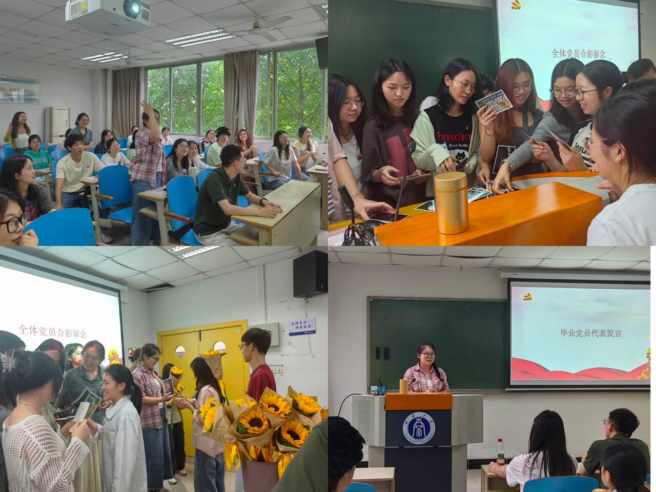 党味“食”足,毕业起航。毕业生党员代表田红英、杨福琴同志上台发言,她们分享了自己在本科生第二党支部的收获,表达了对母校及党组织培养教育的感激之情。最后,支部党员向毕业生党员赠送了精美的毕业纪念品和鲜花并合影留恋。活动在全体党员的重温入党誓词后顺利落下帷幕。