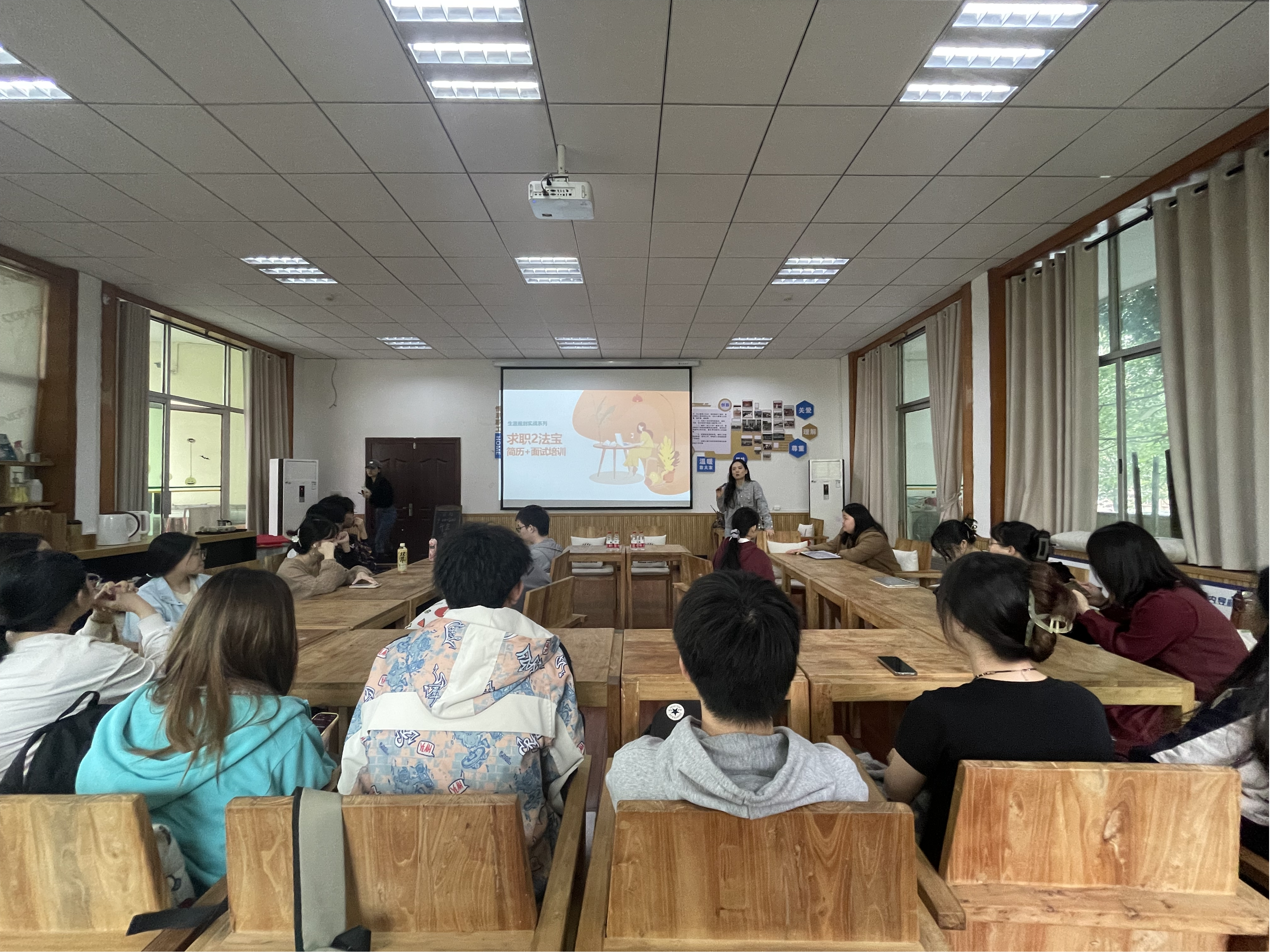 活动现场,周灿从公司招聘人员的角度出发,为学生们详细介绍了如何制作一份让面试官心仪的简历,并分享了一些面试的宝贵技巧。