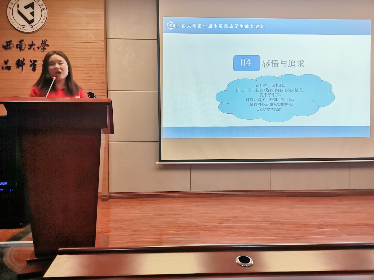 随后,肖宇雪同学为大家分享了她在本科四年的所历所想,从一名普通的大学生,到学生组织部长、队长;她也从最开始进校时的尝试、未知,逐渐成长为一个能勇敢担起责任的人。肖宇雪同学给大家分享了她的“四心一义”,初心、热心、细心、耐心与情义,这“四心一义”贯穿了她的整个大学生活。“主动,才会有故事”,肖宇雪的经历正跟千千万万的在校大学生一样,她的亲身经历和经验总结也鼓舞了在场的同学,要主动地去追求自己想要的生活,要坚持做让自己骄傲的事!肖宇雪同学还说:正是有了西南大学,有了这个后盾,让她可以去到更多更远的地方,相信同学们也能在西大这个优秀的平台上汲取知识,学习经验,绽放出自己的光彩!