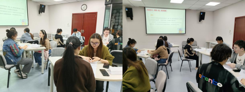 随后,同学们分别开展单面模拟和无领导小组面试模拟。在单面练习中,学生两两一组,分别担任面试官和面试者,模拟了真实面试中的自我介绍、专业提问等环节,通过实际演练加深对面试流程的理解。在无领导小组模拟面试中,数名同学担任面试者,其余同学则担任面试官,面试官负责记录每位面试者的优缺点,并做总结点评。