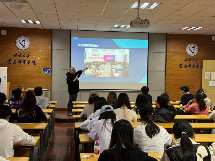 活动伊始,兰天老师介绍了新闻摄影与普通拍摄的区别在于普通拍摄是主观的表达情感,而新闻摄像是客观的呈现事实。随即他展示许多事例,从领导参观、圆桌会议等方面为同学们讲解了在不同场合下的新闻拍摄要点。同时,兰天老师还强调了国旗、党徽等新闻拍摄的细节。
