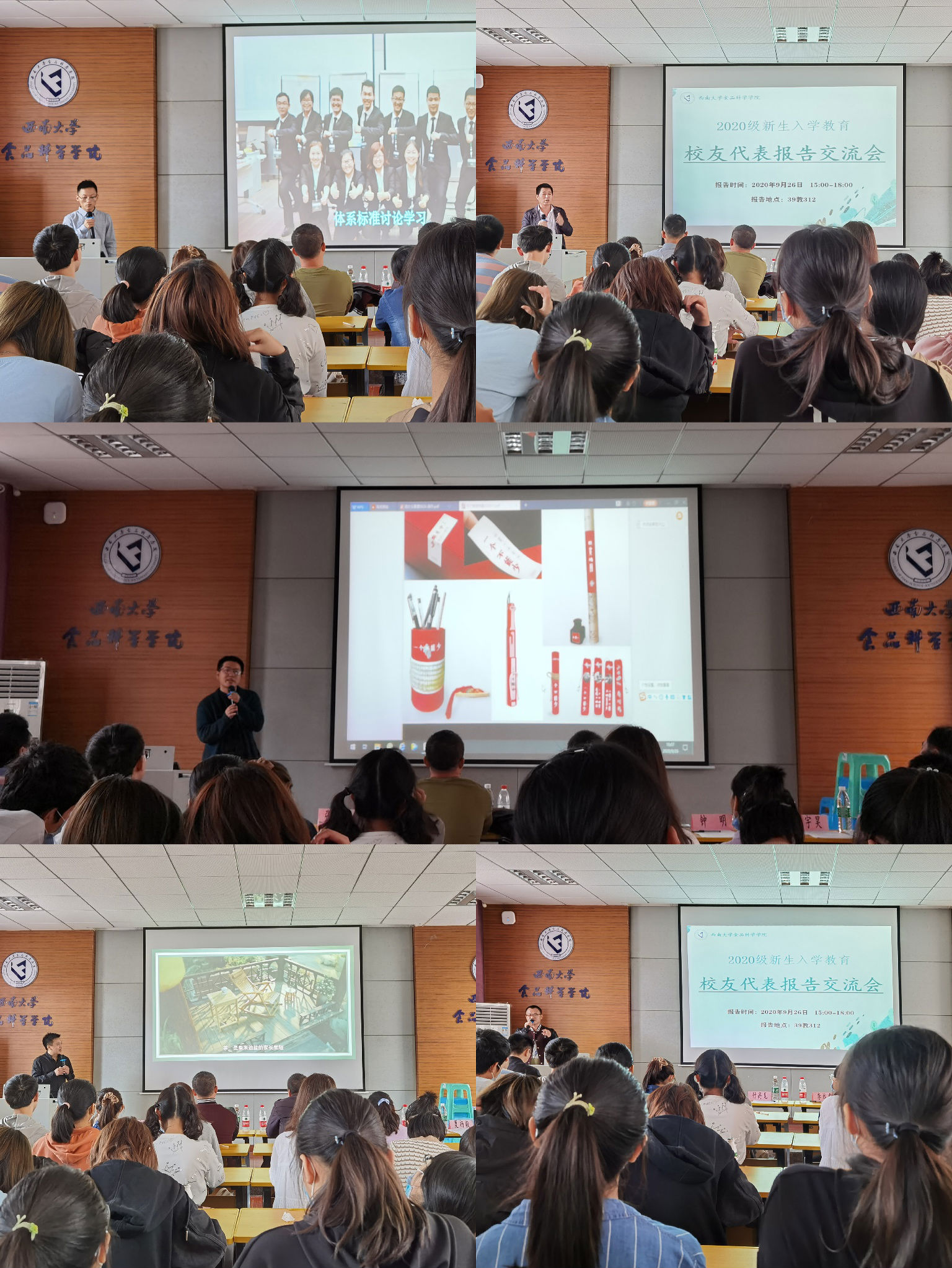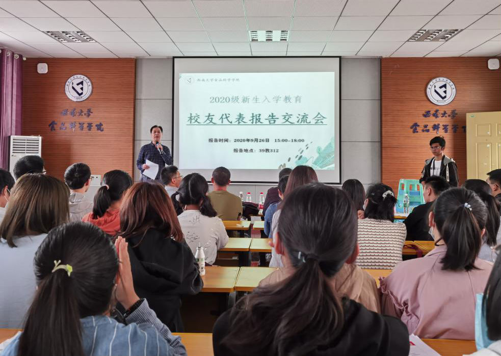 “凉爽的金秋九月,美丽的西南大学。新同学对未来大学生活充满憧憬,但对食品科学类专业了解甚少,对学习生活也存在许多担心……”在夏杨毅副院长娓娓道来中开始了本次交流会,来自PA视讯官网不同专业的校友代表张孝文、李远虎、钟明、吴丹、付高见进行交流分享。